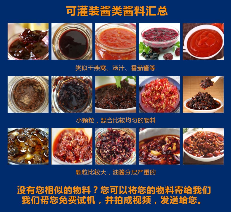 該生產線適合中小口徑三旋、四旋玻璃瓶調味醬的分裝,適合醬料、含顆粒黏稠物料的灌裝,物料接觸部分均采用316不銹鋼