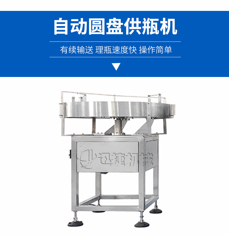 該圓盤供瓶機理瓶機是由人工將瓶子放入圓形轉盤上,轉盤轉動將瓶子有續(xù)撥入輸送帶,進入灌裝機進行灌裝。使用方便,噪音小,理瓶速度快,操作簡單是不可缺少的一個環(huán)節(jié)。