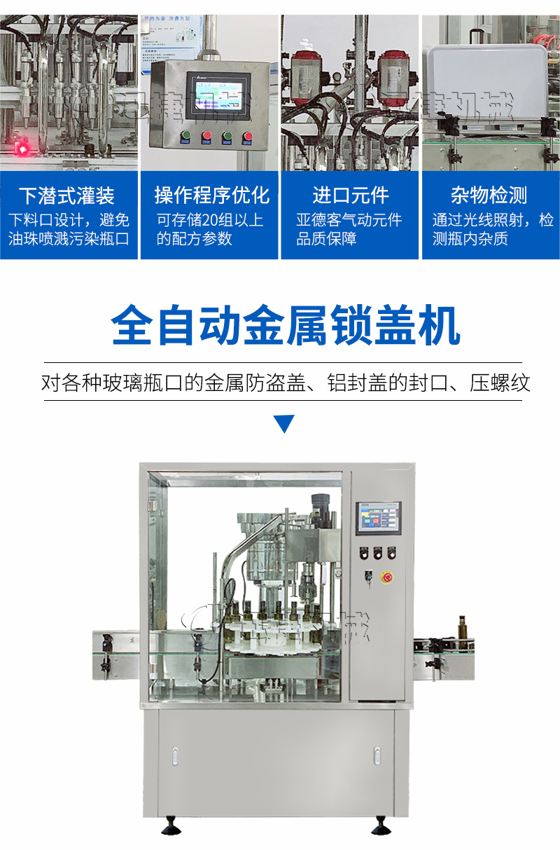 本設備適用于醫(yī)藥、農藥、食品、化妝品、化工等行業(yè),主要針對各種玻璃瓶口的金屬防盜蓋、鋁封蓋的封口、壓螺紋等。該設備可單機使用,也可以與灌裝機等設備組成生產流水線自動作業(yè);