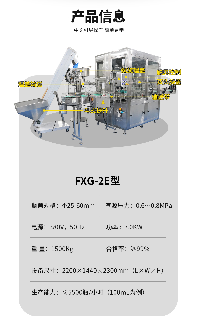 2、品質(zhì)高:跟隨式旋蓋,旋蓋過程不停頓,不晃液,不污染瓶口、瓶身及輸送帶,確
