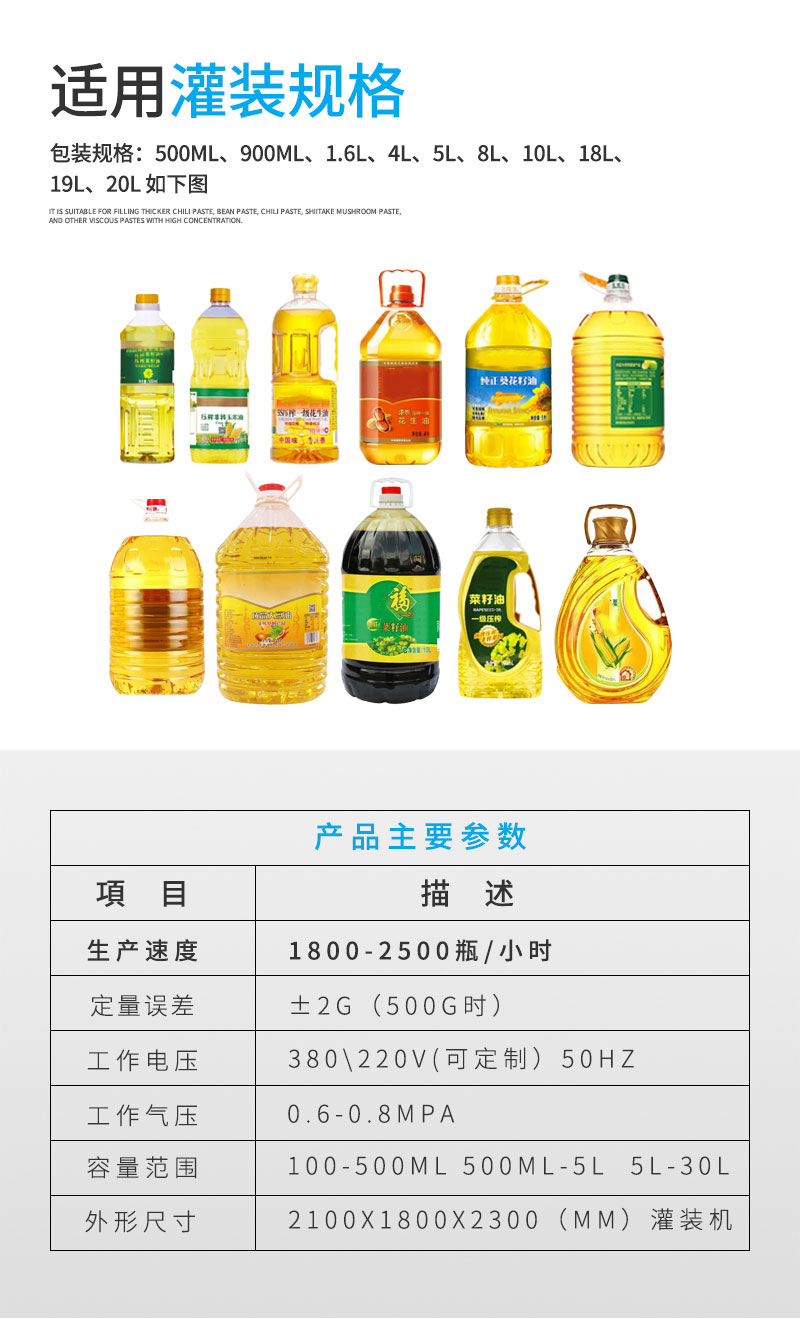全自動食用油灌裝生產(chǎn)線根據(jù)用戶需求非標定制,灌裝部分為八頭灌裝機,適用于不同瓶子的灌裝,配備壓蓋機和貼標機,自動化程度高。