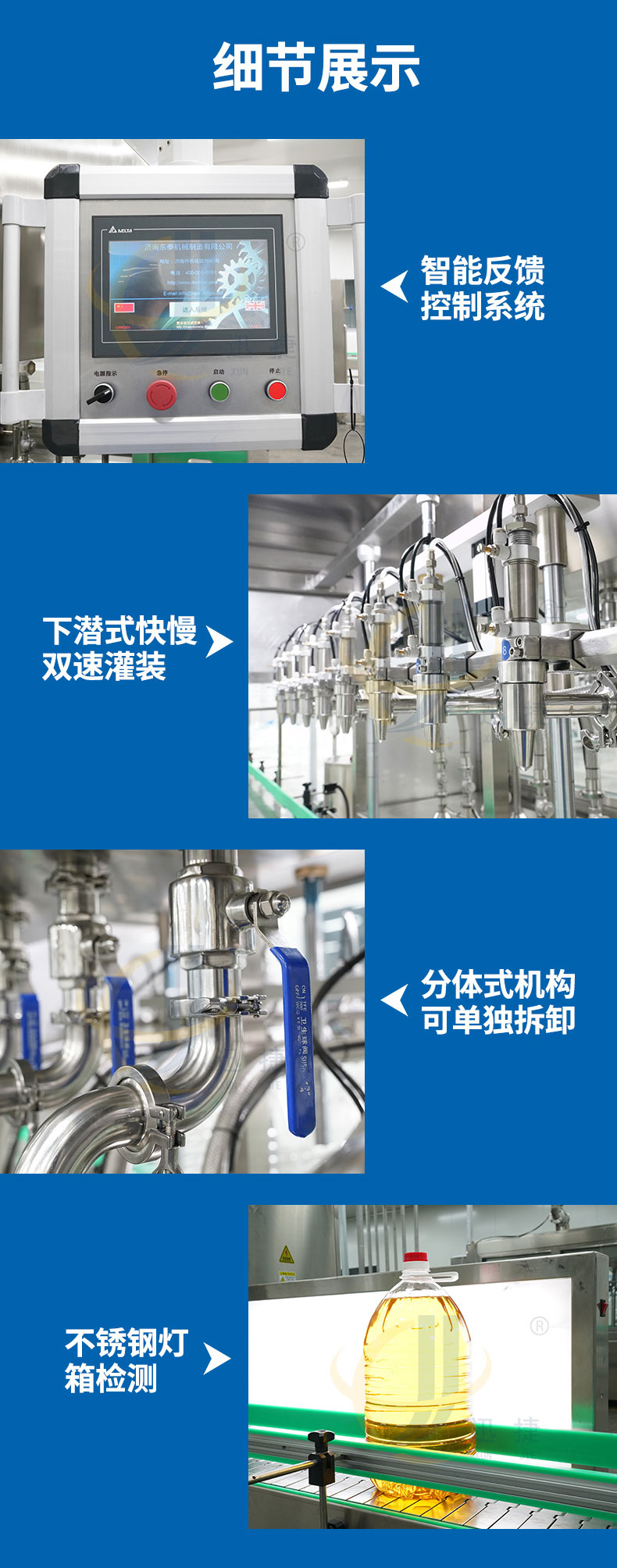 全自動八頭食用油灌裝機單頭單泵單變頻控制,容積和質(zhì)量兩種計量方式自由轉(zhuǎn)換,灌裝調(diào)節(jié)方便快捷。