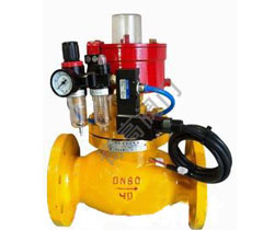 氣動(dòng)緊急切斷閥氣源入口按裝一只二位三通電磁閥,利用遠(yuǎn)程電器控制臺(tái)控制閥門開關(guān)。