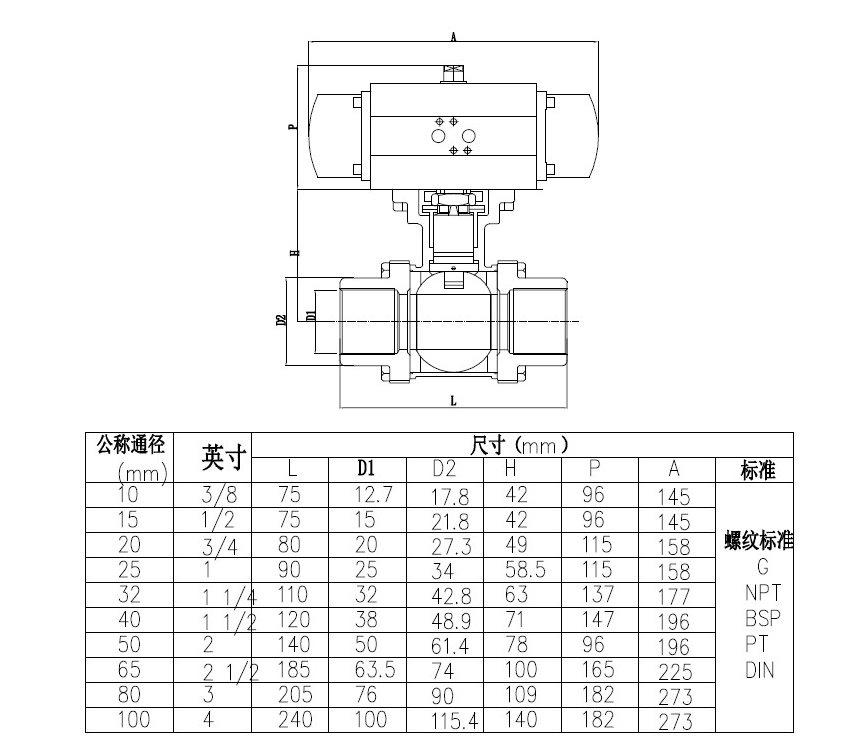 ● 氣動三片式球閥尺寸圖