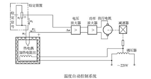 如果將控溫過程中的人工操作 (檢測和調(diào)節(jié)) 換由自動控制裝置完成,則成為包裝機(jī)自動控溫系統(tǒng)。如下圖所示,檢測元件熱電偶檢測恒溫箱內(nèi)的溫度,并將溫度轉(zhuǎn)換為對應(yīng)的電壓信號2 ,同時(shí)反饋給比較器。比較器比較表示給定溫度的給定電壓信號1與檢測電壓信號2的大小,得到溫差信號,其大小和正負(fù)代表溫差的大小和方向。溫差信號△經(jīng)電壓放大和功率放大后,控制執(zhí)行電機(jī)的轉(zhuǎn)速和方向,執(zhí)行電機(jī)通過傳動裝置拖動調(diào)壓器觸頭調(diào)節(jié)供熱電壓。當(dāng)溫度偏高時(shí),動觸頭向著減小電壓( 電流)方向轉(zhuǎn)動; 反之,當(dāng)溫度偏低時(shí),動觸頭則向著增大電壓( 電流)方向運(yùn)動,直至恒溫箱內(nèi)溫度達(dá)到給定溫度,溫差信號△=0 時(shí)觸頭停止運(yùn)動。